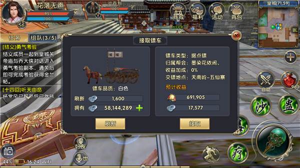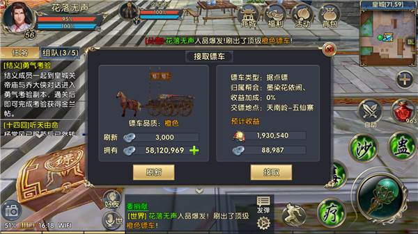 2、镖车的品质,一共分为五种,分别为白色、绿色、蓝色、紫色以及橙色。不同品质的镖车,所获得的任务奖励也不同,诸位同道可以点击刷新,花费银两来更换镖车的品质,从而获得更高的受益。所以如果囊肿不是特别羞涩的话,还是可以刷新几次,争取刷到更高品质的镖车的,一旦刷出橙色,则会有系统公告,昭告天下哦!