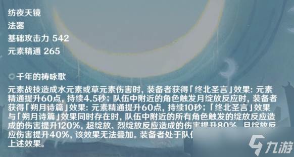基础攻击力542,元素精通是265,武器被动效果也和元素精通、以及绽放伤害有关。