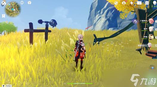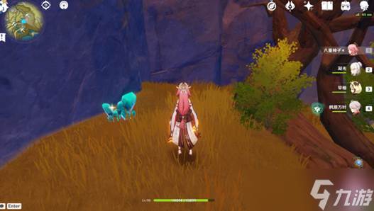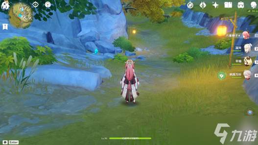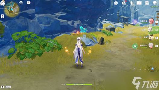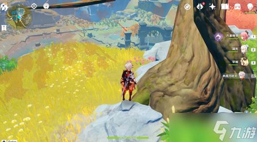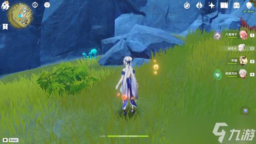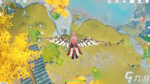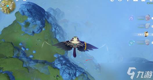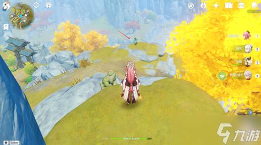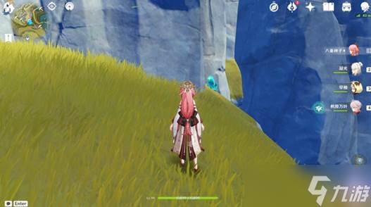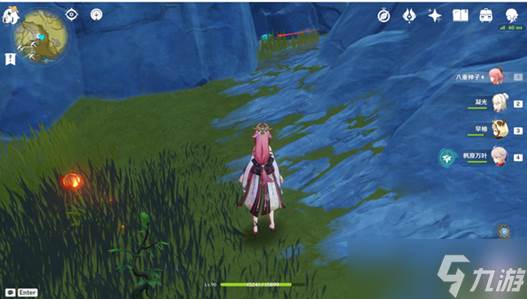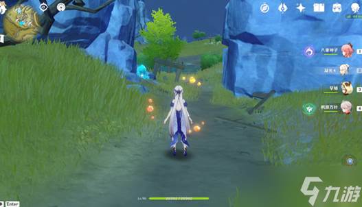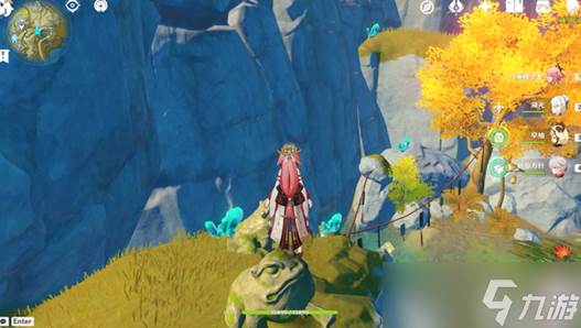 9、在第八处朝东南方向飞过去,我们会看见两个丘丘人,在右边崖壁的下面有2个水晶矿。