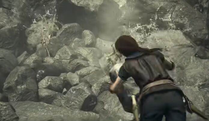 6、身后会有一个被石头堵住的河道,用石头将堵住的石头砸开。