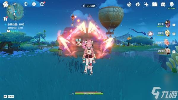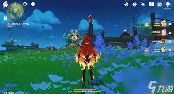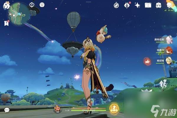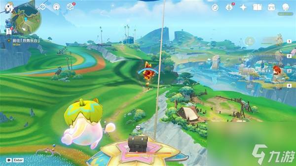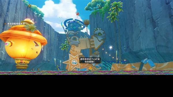 这个神瞳是最难拿取的,需要先魂附阿夏,再到热气球上开启限时挑战(挑战位置如下图所示),挑战中即可获取。注意,不要傻傻的玩成平台跳跃!用阿夏喷绘的技能,喷涂空中的花叶,即可开启隙道,大大降低难度(别问我怎么知道的,因为我就是那个玩成平台跳跃的)