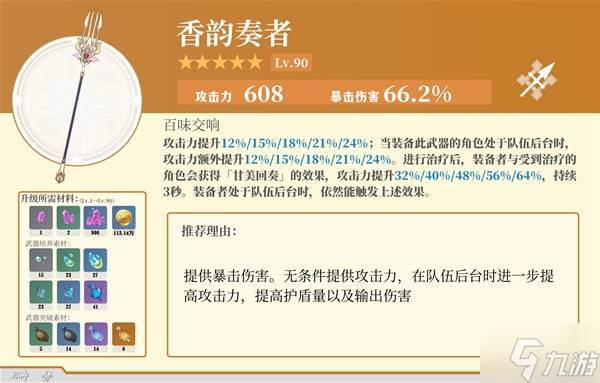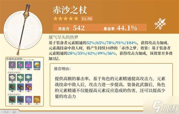 提供高额的暴击率。基于角色的元素精通提高攻击力,元素战技命中敌人后,攻击力进一步提高。装备此武器后,角色的元素精通不仅能提高元素反应造成的伤害,还可以提高少量的攻击力