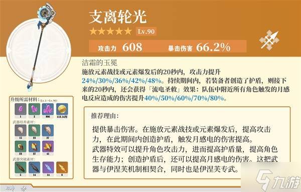 武器特效可以提升角色攻击力,进而提高护盾量,提高角色生存能力;创造护盾后,还可以提高月感电的伤害。这把武器与伊涅芙机制相契合,同时也是伊涅芙专武。