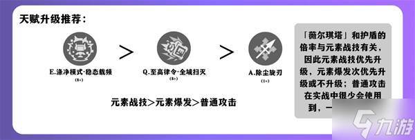 「薇尔琪塔」和护盾的倍率与元素战技有关,因此元素战技优先升级,元素爆发次优先升级或不升级;普通攻击在实战中很少会使用到,一般无需升级