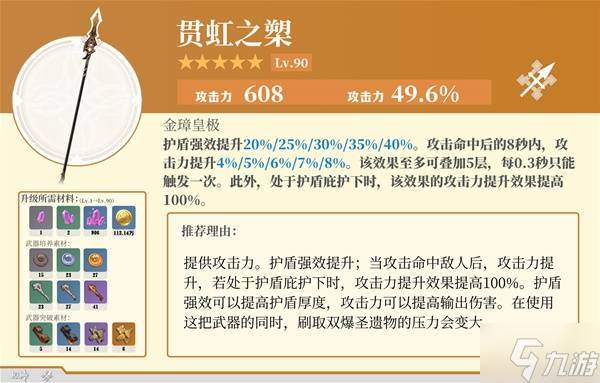 提供攻击力。护盾强效提升;当攻击命中敌人后,攻击力提升,若处于护盾庇护下时,攻击力提升效果提高100%。护盾强效可以提高护盾厚度,攻击力可以提高输出伤害。在使用这把武器的同时,刷取双爆圣遗物的压力会变大