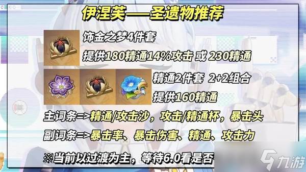 双暴、精通、攻击力按序选武,攻击超2000可调精通圣遗物。【圣遗物推荐】饰金之梦4件套,2雷1水1风/岩配队提供180精通14%攻击;也可选精通2件套组合过渡。主词条选精通/攻击沙,攻击/精通杯,暴击头。副词条重暴击率、伤害、精通、攻击。建议选精通沙+攻击杯,易得好评词条。