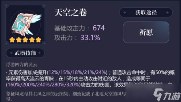 1、武器拥有674极高的白值,副词是攻击力加成,武器效果也是通用的元素伤害加成;
