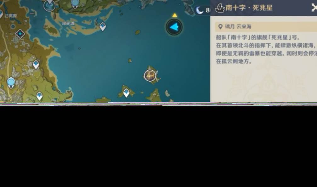 死兆星号是北斗的旗舰,在璃月进行相关任务时需要前往该船。这艘船停泊在璃月孤云阁东南方向的海域,虽然地图上不会直接显示其位置,但在孤云阁区域可以清晰看到这艘醒目的大型船只。首次成功登船后,系统会自动解锁传送功能,方便后续快速往返。