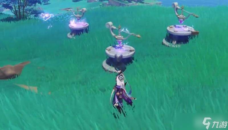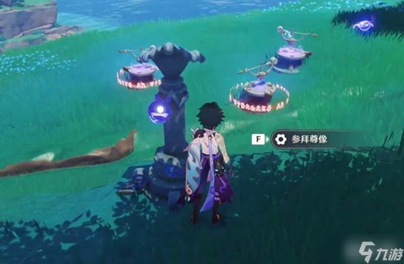 在曚云神社草地上可以看到三个指针和一尊海祇尊像。首先需要参拜这尊佛像,随后会出现一个移动的雷灵。当雷灵停在左侧时再次参拜佛像,这时第一个雷灵会固定位置,同时出现第二个雷灵。此时左侧指针对应左侧雷灵,右侧雷灵会移动到对应位置。