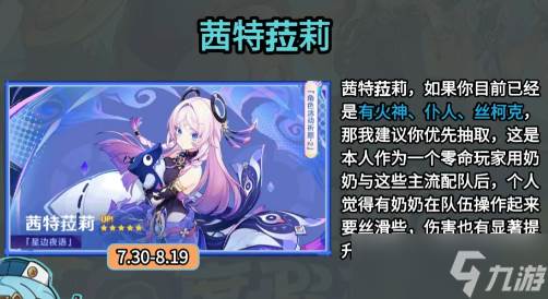 推荐抽取,而且建议至少抽到2命,解锁元素队友种类限制和增伤限制,后台队友考虑玛薇卡、芙宁娜、茜特菈莉等能提升队伍上限,御枪飞行在纳塔整个强化大世界能力的版本也是最优秀的能力,游戏体验大大提升。