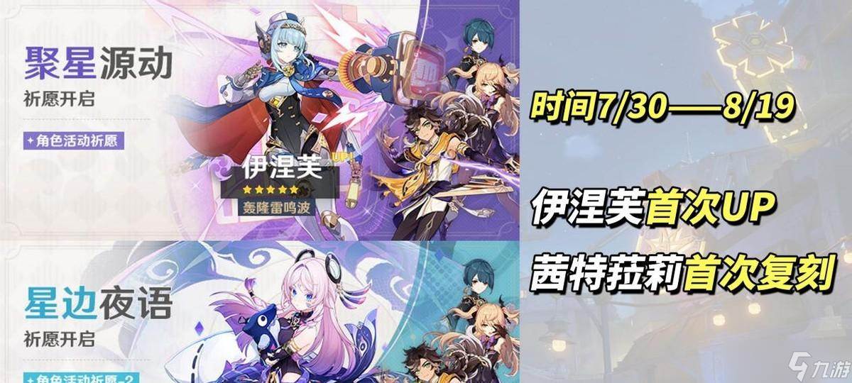 伊涅芙、茜特菈莉、赛索斯、行秋、菲谢尔。其中伊涅芙配合本期4星角色可直接构成完整的1金4人队伍,茜特菈莉则需搭配你自身持有的其他角色组队了。