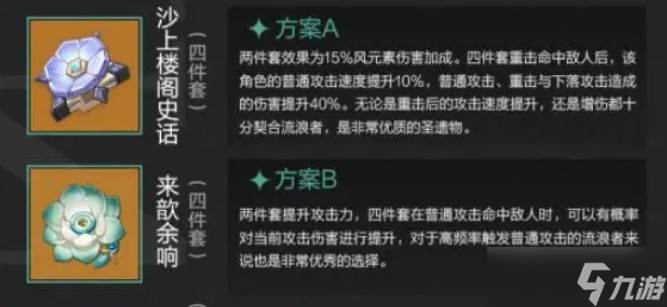 流浪者拥有自己专属的楼阁套圣遗物,这套圣遗物和流浪者的输出模式十分契合。不过对于已经满命状态并且想要追求更高上限的玩家来说,余响套会更加强力。首先余响套不仅可以提升流浪者本身的普攻输出,还可以让他的六命效果更进一步,享受到套装效果的加成。觉得刷以上两套圣遗物比较麻烦的玩家,也可以去选择绝缘套的副产物追忆套,对于平民玩家来说也是不错的选择。