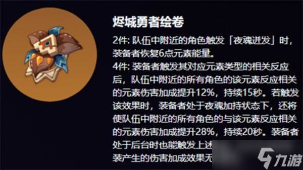 四件套效果:当装备者触发元素反应时,为相关角色提供15%元素伤害加成,持续10秒;若处于夜魂加持状态下,该增伤效果可叠加至30%。