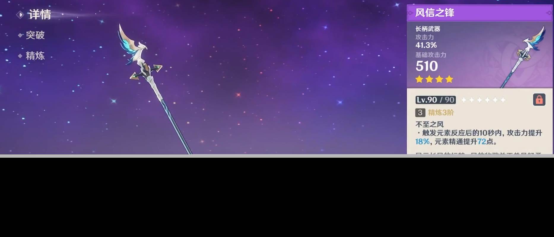 风信之锋是一把四星长柄武器,基础攻击力510点,副属性提供41.3%攻击力加成,特效触发元素反应后10秒内提升12%攻击力和48点元素精通。这把武器可以通过活动获取,精炼材料也能在活动中兑换,适合香菱这种依赖元素反应的角色。