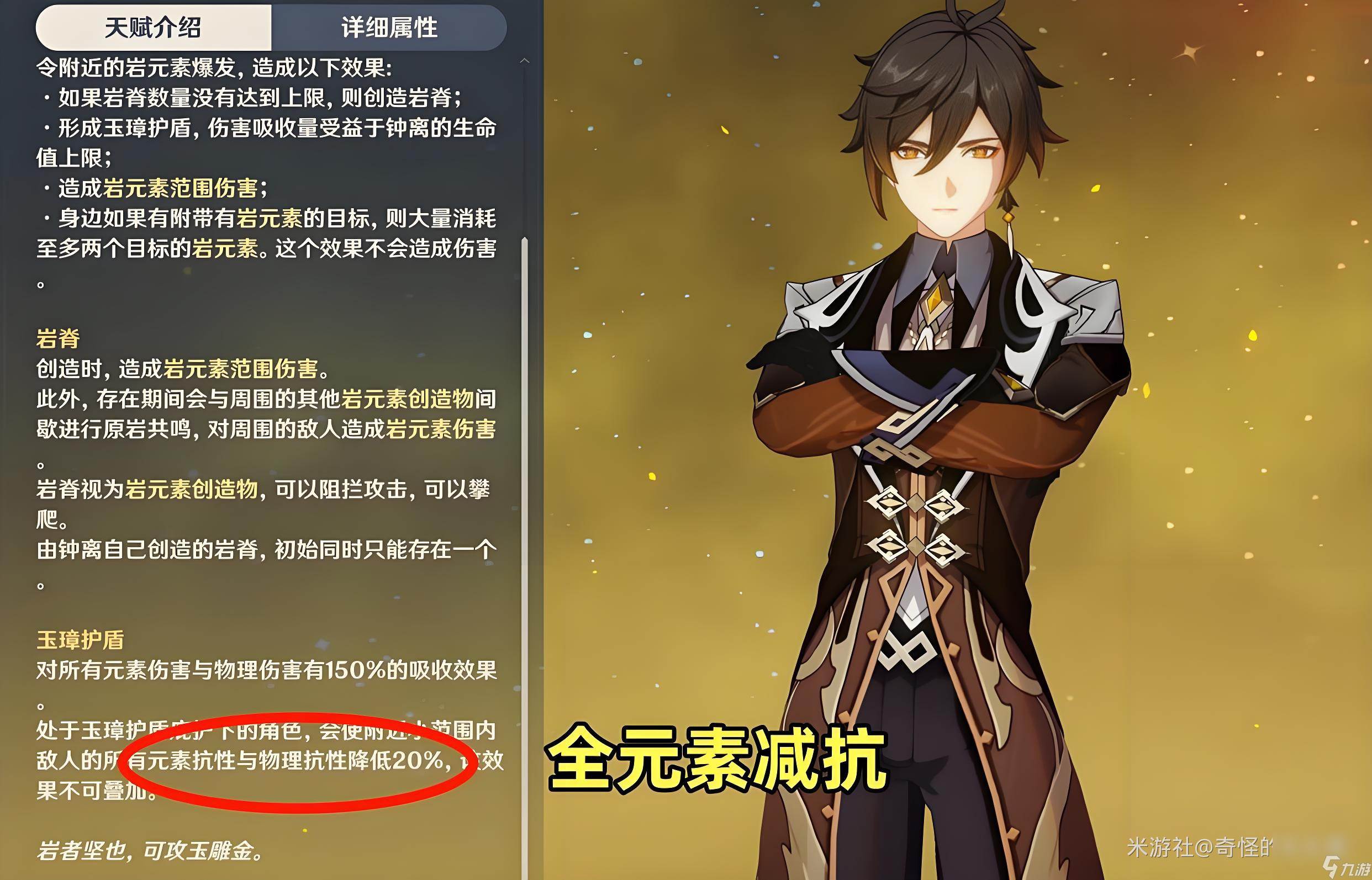 2、其次就是减抗能力只有20%。说实话,就现在版本来看,确实算是蚊子腿了。只是全元素减抗的机制,比较泛用,使得钟离在当前版本,虽有上场的机会,但也只能当作“替补”了。
