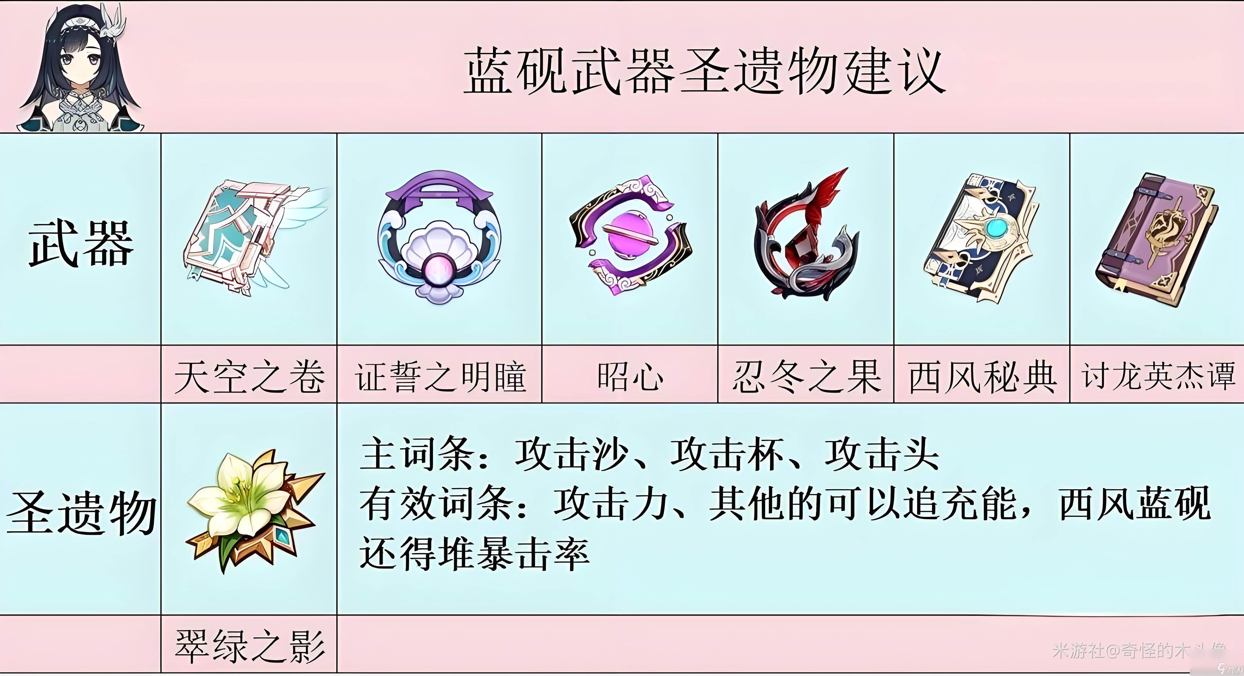 至于武器,直接选攻击力词条的即可。推荐天空之卷、证誓之明瞳、昭心、忍冬之果,甚至还能带讨龙、西风秘典等法器,还能进一步拐主C的输出能力和队伍的循环能力。