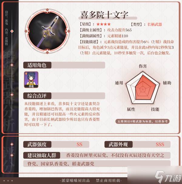 从技能描述上来看,喜多院十文字还是蛮契合香菱的,增加锅巴伤害,而且还能提高大招充能,并且精通还可以提高-些火元素的反应伤害,由于目前长柄武器较少所以也只有香菱暂时可以用一下了。