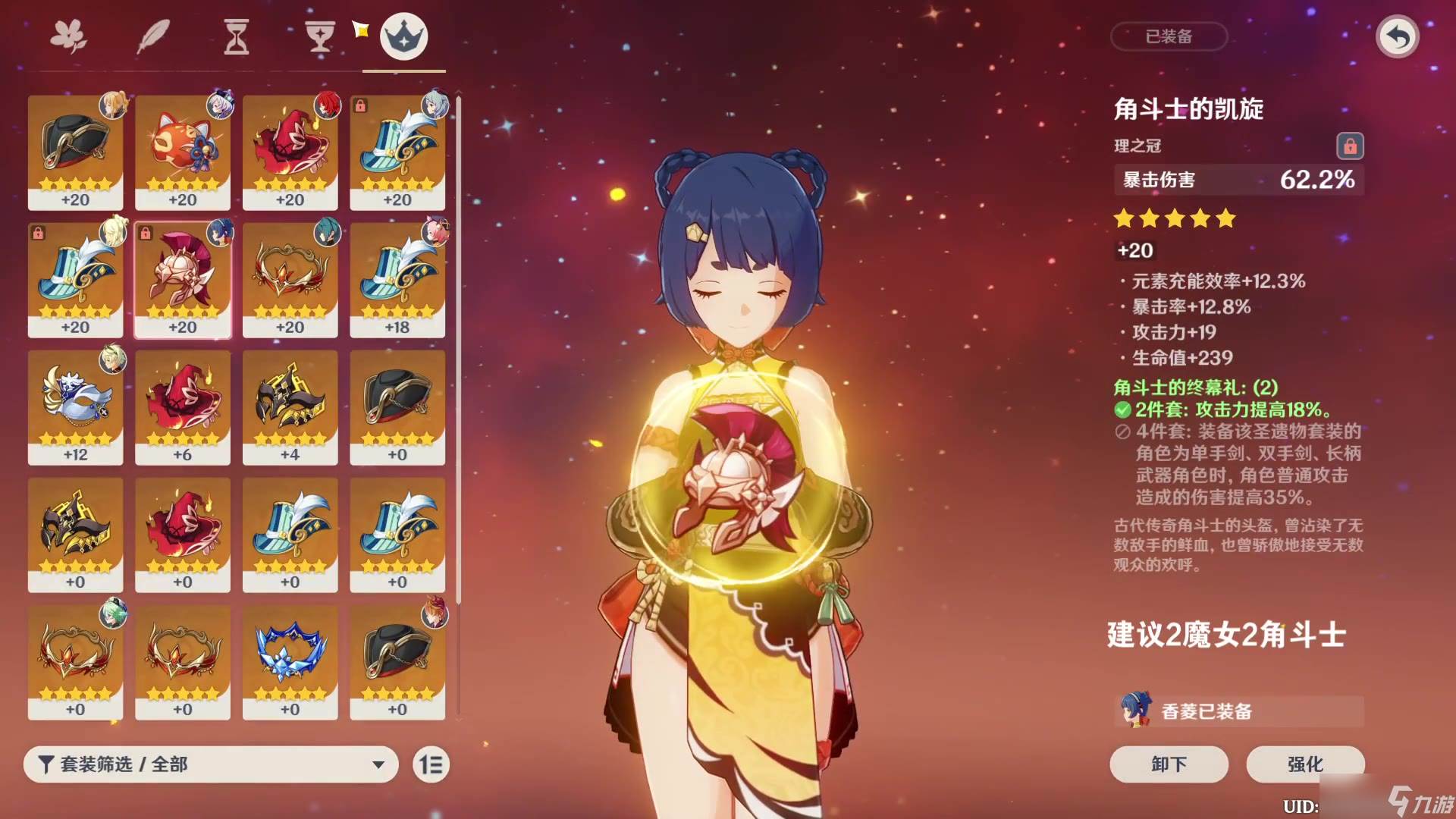 香菱的圣遗物选择有很多搭配,主要取决于她的技能特点和在队伍中的定位。香菱的元素爆发是她的核心输出技能,因此需要优先考虑能够提升其大招伤害和释放频率的圣遗物套装。那么绝缘之旗印四件套是最适合香菱的圣遗物套装,在搭配绝缘二件套的时候,可以提升20%的元素充能效率,这对于香菱来说非常重要,因为她的大招需要消耗大量的能量。四件套的效果会更好,元素充能和套装加成更多,让香菱的实际伤害增加。