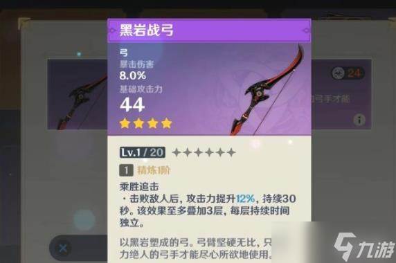 黑岩系列武器的主要优势在于副词条提供暴击伤害加成,这在四星武器中还是较为稀有的,对输出角色的伤害提升有很大的帮助。此外,黑岩系列武器的被动效果也是一致的,名为乘胜追击,可以在装备者击败敌人后提高自身的攻击力,该效果最多可以叠加三层,每层提升的幅度依据精炼等级而定,基础为12%,满精炼后可以达到24%,加成至多持续30秒,每层加成的持续时间独立。
