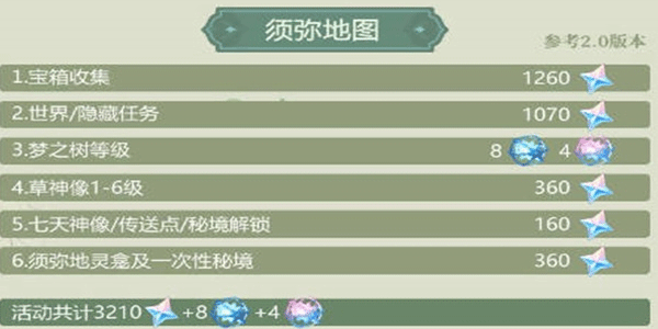 2:须弥地图可以获得3210原石,其中宝箱收集获得1260,世界隐藏任务1070,梦之树等级可以获得抽奖次数,七天神像解锁获得160,地灵龛一次性的东西可以获得360;