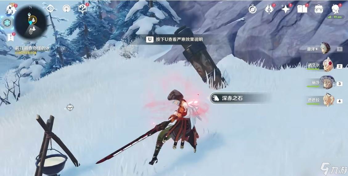 龙脊雪山区域,玩家会遇到一种特殊的奇怪的冰,这种冰无法通过普通攻击或火元素直接融化。破解的关键在于寻找并利用场景中的深赤之石。击碎深赤之石后,玩家会获得短暂的红光环绕效果,攻击奇怪的冰即可将其击碎。深赤之石通常分布在冰块附近,但其效果有时间限制,需尽快行动。若中途攻击其他目标或时间耗尽,需重新拾取深赤之石。