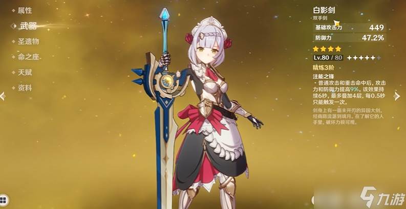 五星赤角石溃杵为毕业武器,副属性88.2%爆伤与防御力加成完美契合诺艾尔机制。四星白影剑可通过锻造获取,精炼五阶提供99.7%防御力加成,性价比最高。若追求循环流畅度,天空之傲的充能副属性可作为替代方案。注意武器被动效果与圣遗物联动,例如白影剑需普攻叠层,华馆套需后台预热。
