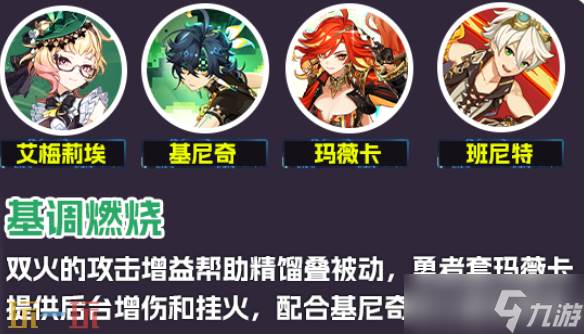 原神艾梅莉埃基调燃烧队以艾梅莉埃为核心,搭配基尼奇、玛薇卡、班尼特组成燃烧反应队伍,玛薇卡提供后台增伤和挂火,配合基尼奇可以速切燃烧,通过火草元素反应打出持续伤害。