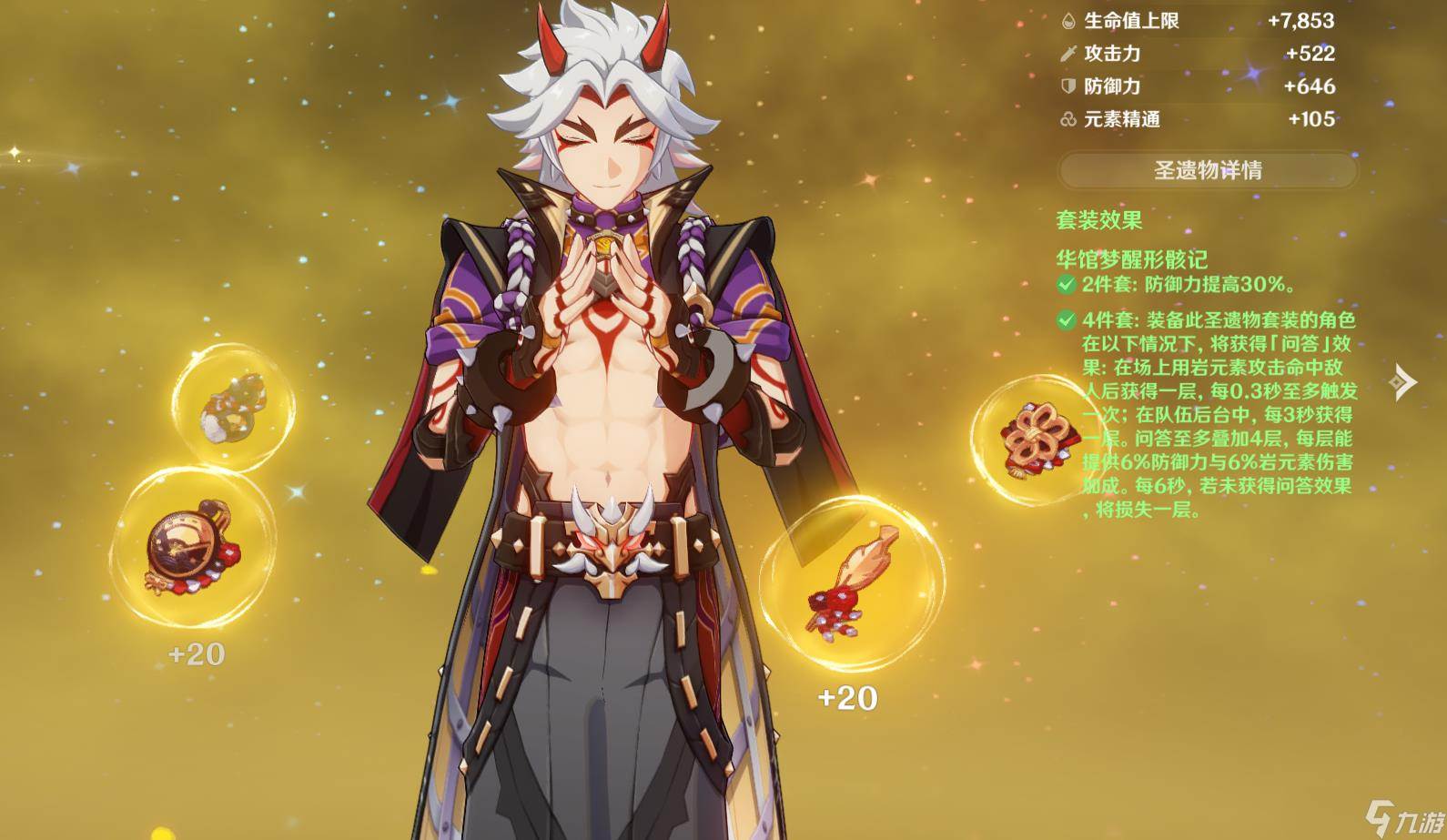 圣遗物推荐4华馆没有第二个选择,前期可以用2华馆2磐岩过渡一下,一斗是可以轻松吃满4华馆的,华馆的效果是在前台每次岩元素攻击都可以叠一层,有0.3秒的CD,触发了身上就会有数字标注,最多四层,这0.3秒就很合理,即使我们开大打有攻速加成,但是每次打一下都是会叠一层华馆,如果6秒内没有触发则会掉一层,数字也会逐渐减少。在后台我们的角色即使不攻击,是可以每3秒获得一层的,所以我们在打深渊的时候,建议不要把一斗放在第一位,让别的角色先站几秒再去开怪,等切一斗的时候,直接就是满层花馆,大世界也是如此,我们可以先用别的角色去跑路,到打怪的时候,直接切出满层的华馆的一斗,所以阿贝多如果带华馆,也不要把它放在第一位。
