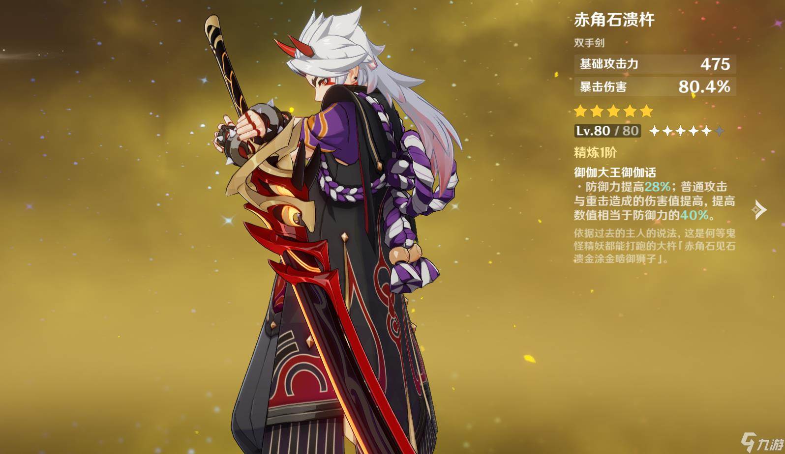 荒泷一斗武器推荐赤角石溃杵、螭骨剑、白影剑、天空之傲、桂木斩长正和白铁大剑,赤角石溃杵88%的暴伤,特效不光提高防御力,还提高倍率区间,没有也没关系,螭骨剑也是很优秀的。锻造的白影剑因为特效,所以就必须事先叠层再放大,我们只需要普攻4下就可以叠满了,叠满了要抓紧时间开大招,不然等一会华馆层数是会掉的。天空之傲和桂木斩长正是让一斗大招循环更加流畅,三星武器的白铁大剑也是可以的,满级提供44%的防御力。