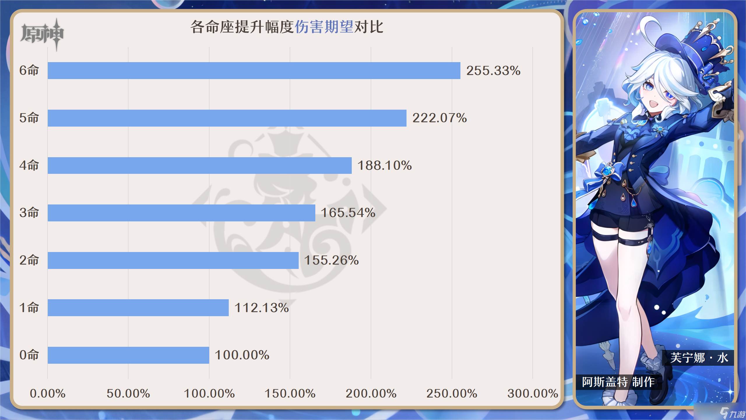 【2命】该命座不仅限于芙宁娜,对队友的提升也十分不错。解锁该命座后,芙宁娜可迅速叠满气氛值的增伤层数,在大部分持续时间内都是最大增伤加成。该命座的全过程平均生命加成在90%左右,全程平均增伤在85%-90%。
