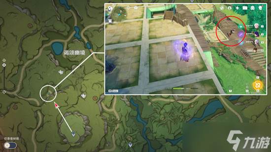 2、然后打开须弥城的地图,传送到遏颂幽静下方的锚点,往西北方向走找到第一个营地。