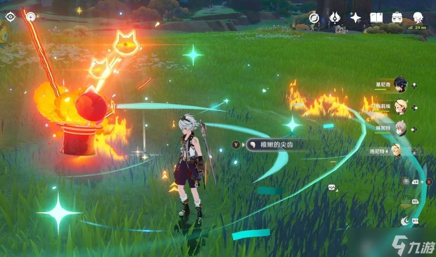 环绕射击和回猎贯鳞炮都为弱草元素附着,环绕射击每两秒最多附着一次,回猎贯鳞炮则是每次都有附着,大招是常规两点五秒,对同一只怪是每隔一次攻击产生一次附着,一次大招对同一只怪最多产生四次弱草附着。附着频率不是很高,开启战技后的首次回猎贯鳞炮是固定产五个球。