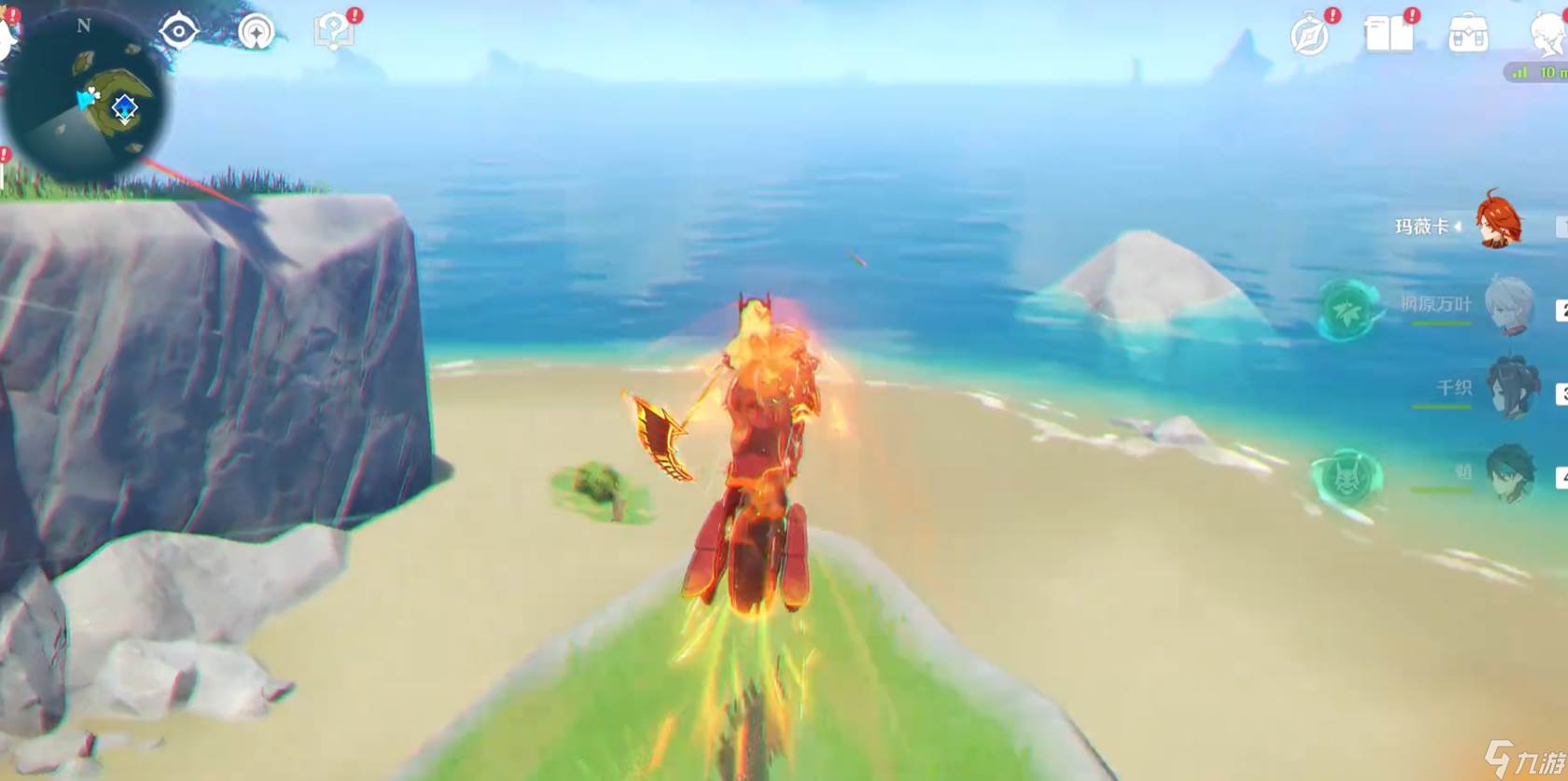 反而是利用地面和石头斜面组成了一个飞跃的斜面平台,玛微卡会骑乘着摩托直接继续往天上飞行一段距离,然后才会出现下降落在地面上的趋势后落地。熟悉好这个弹射飞跃的操作之后,对玛微卡的跑图体验帮助还是很多的。最直接的便是在速度上会快一些,还不用特意的避开一些要绕路的障碍。同时空中移动同样的距离时,其消耗会比在正常的地面上行驶要少一些。精打细算下能够帮助玛微卡减少一些燃素的损耗,比起绕路消耗更多自然是划得来多了。