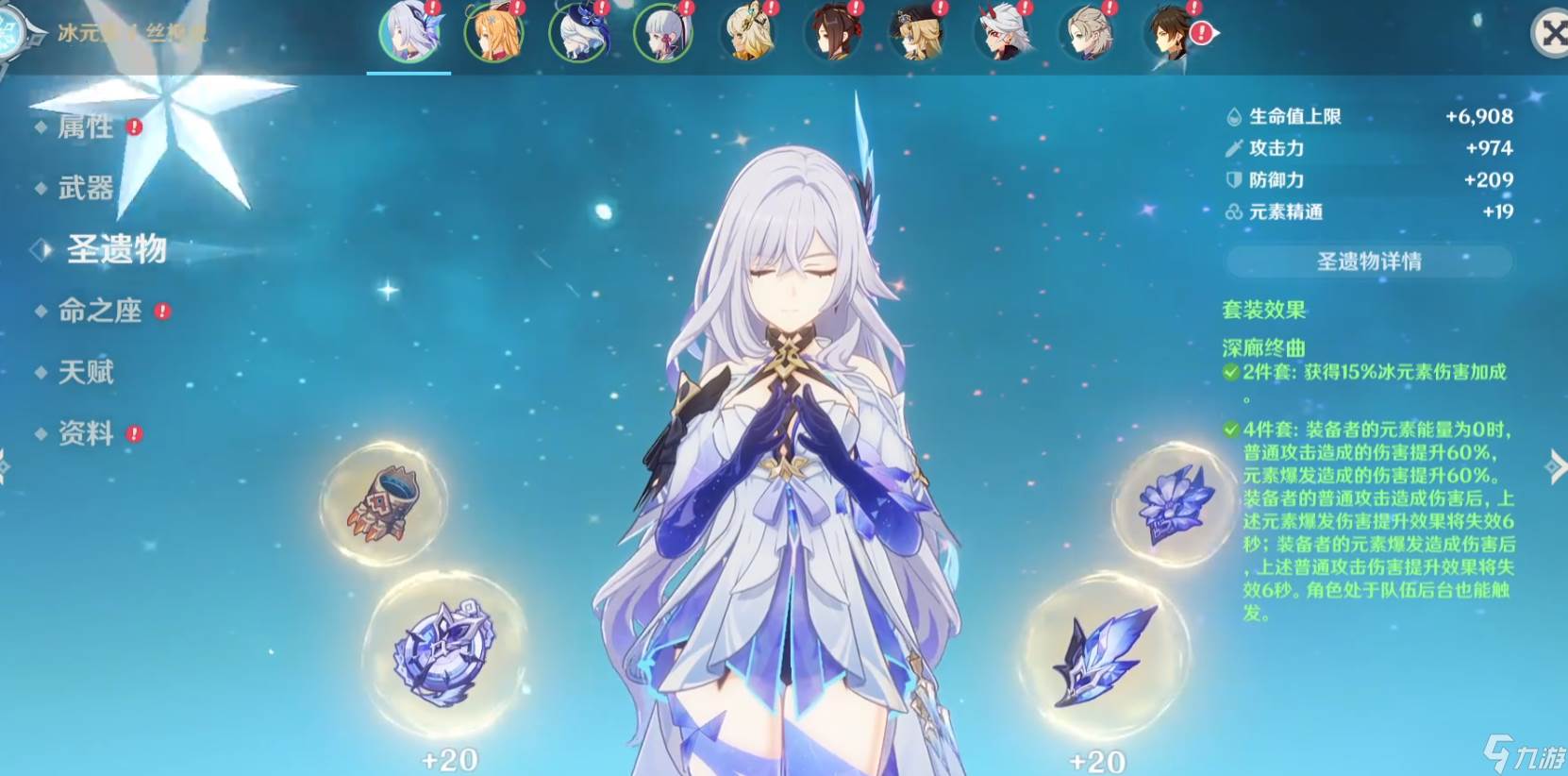 丝柯克在遗器的上选择也是比较多的,她不像是常规的人物那样。一般只有一套相对契合的遗器能够使用,不过要说的话其实更像是丝柯克专用的遗器数据比较一般。没有那种碾压式的领先于其他的套件,才给了不少的老玩家能够直接用之前的遗器的机会。不过要说强度上的表现最合适的,还得是独属于丝柯克的深廊终曲这套了。两件的时候给到丝柯克直接十五的冰属性强度,四件则是完全就是为了丝柯克设计的触发条件。只有她能在没有能量的情况下,继续驻场战斗或是释放出爆发出来。