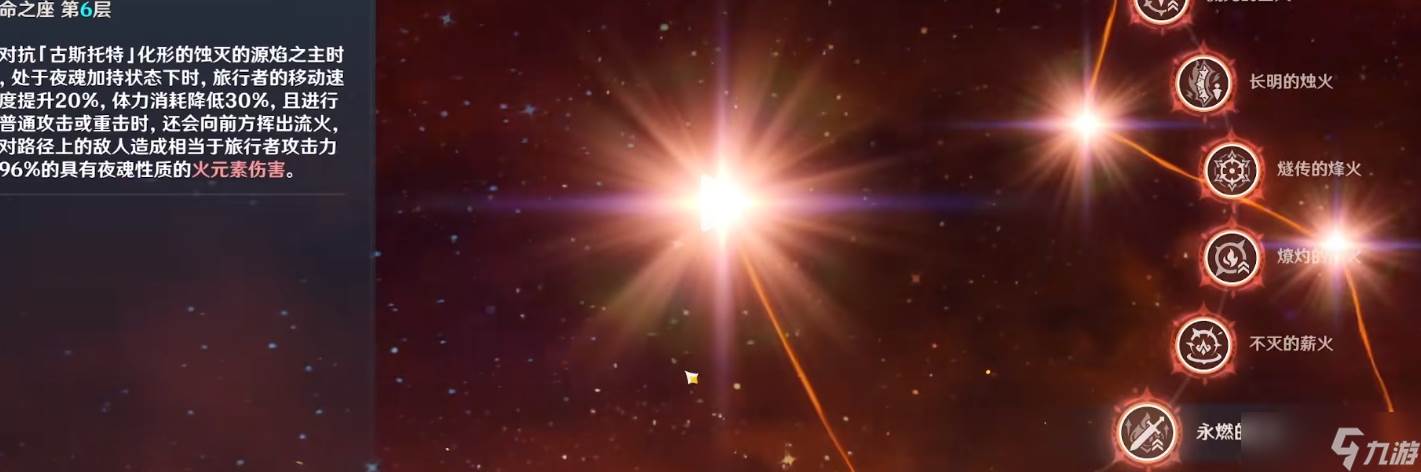 首先咱们需要知道的是5命不重要,五命就是非常惯例的增加技能的基础数值,整体的作用非常的小,并不会额外增加效果和属性。六命的话是需要我们拿到了沃路之邦的4级之后我们才可以点,没有拿到的话是不能学习的。一命是我们的元素战技存在的期间,场上的角色伤害提升百分之六。如果当前场上的角色处于夜魂加持状态,造成的伤害还会额外再提升百分之九。