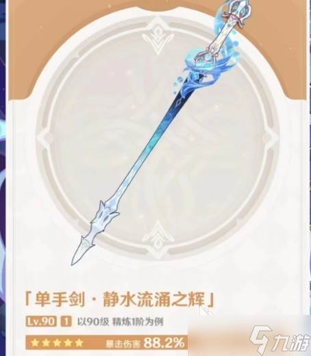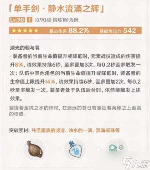 第二把新武器则是五星的“静水流涌之辉”,该武器属于新角色水神芙宁娜的专武,其品质和属性自然要比四星高出一筹,542的基础攻击和88.2%的暴伤加成令角色在进攻端得到了极为明显的加强。