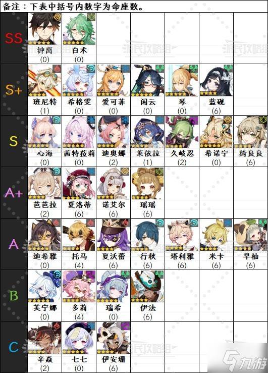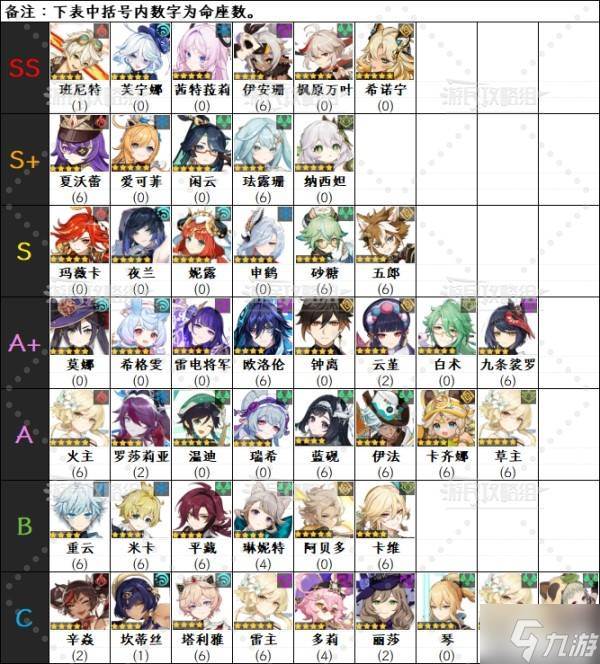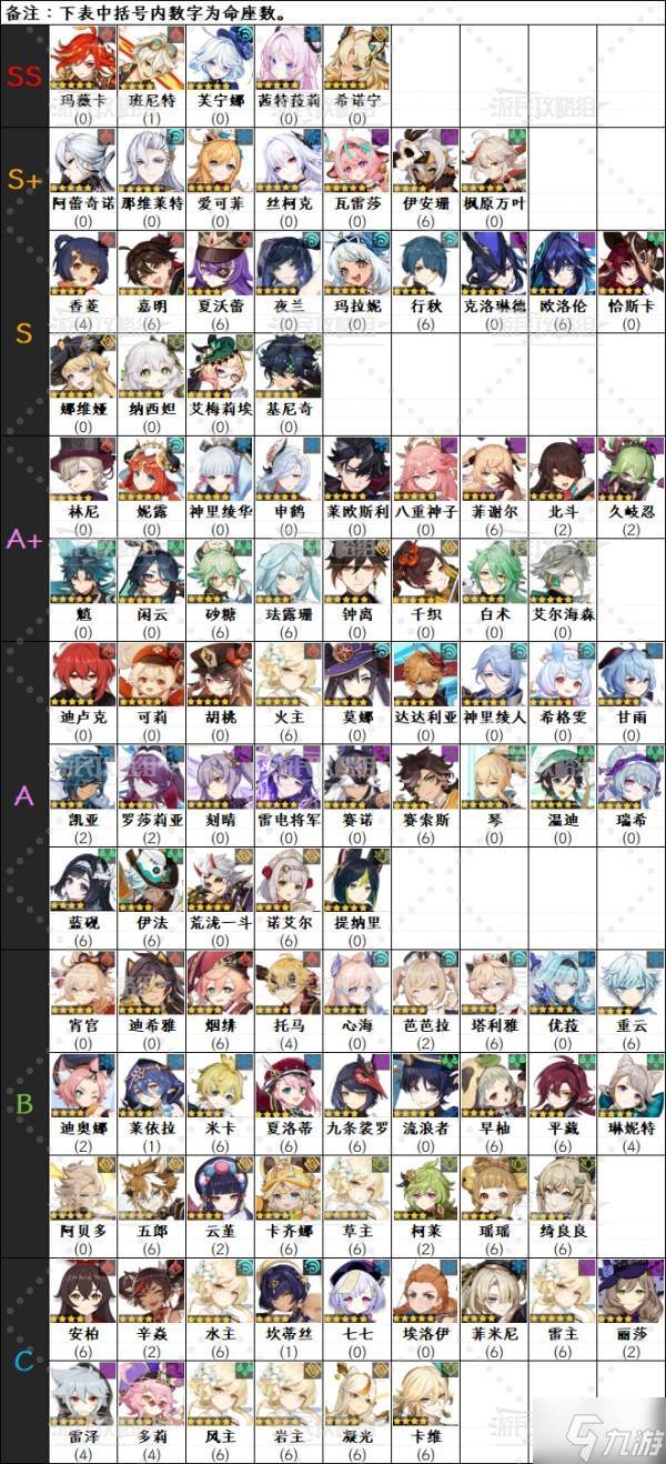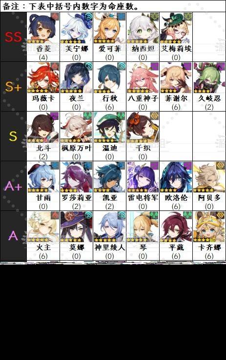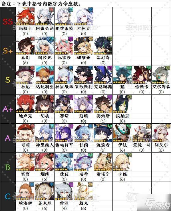 ※下方角色名后括号内数字为命座数,角色排名可能会受其他因素影响。