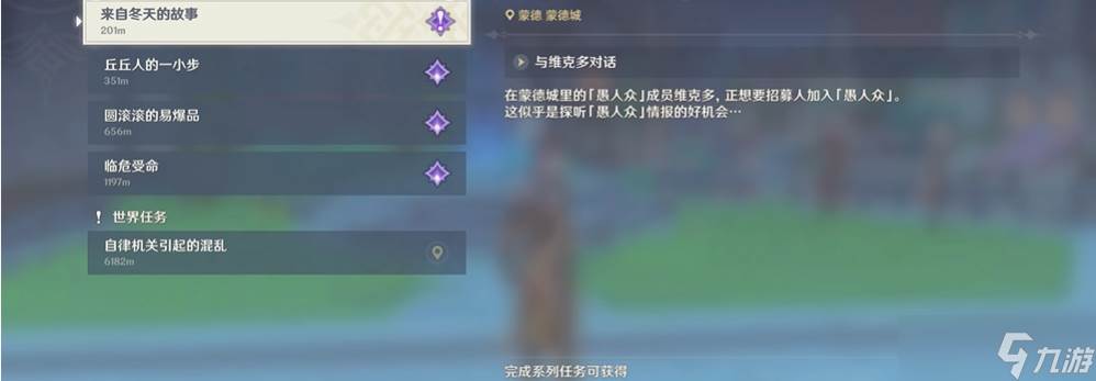 来自冬天的故事任务接取地点在蒙德大教堂,与愚人众NPC维克多对话即可触发。任务会提供三个情报选项:关于愚人众关于邪眼关于女皇陛下,每次只能选择其中一项。选择关于愚人众需要击败丘丘人并获取战利品;关于邪眼要求击败盗宝团;关于女皇陛下则需击败遗迹守卫。每次完成任务后,需等待该委托再次刷新,并确保下次选择不同的选项。