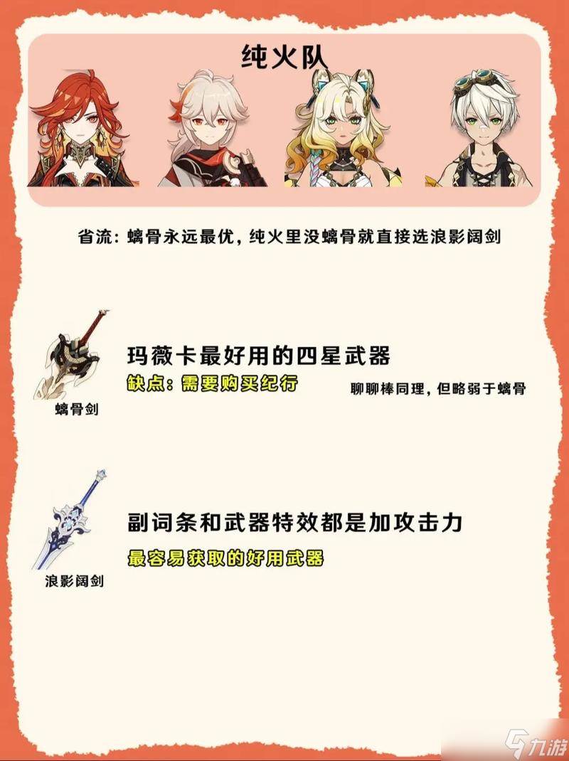 其次直接主c。高命的火神不用多说,拥有大量的攻击力加成和元素反应倍率,而低命的火神也很有抽取的必要,比如纳塔战舰火神+班尼特+奶奶+减抗角色能让你不管是深渊还是大世界都很自在,只要可以给怪物挂冰并且减抗,一刀几十万的伤害轻轻松松。就算没有其他纳塔角色辅助,还有其他四星角色可以加入队伍, 凯亚、砂糖等也是不错的选择。