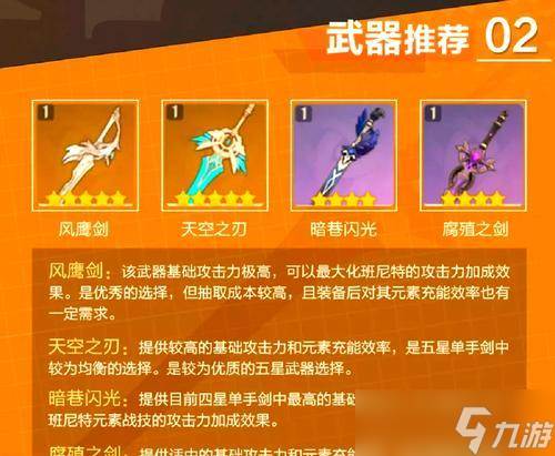 在选择班尼特的武器时,五星武器是首选。其中以「天空之刃」和「和璞鸢」最为适合班尼特的辅助角色定位。天空之刃可以提供额外的元素伤害加成,而和璞鸢则能够增强班尼特的元素爆发能力。