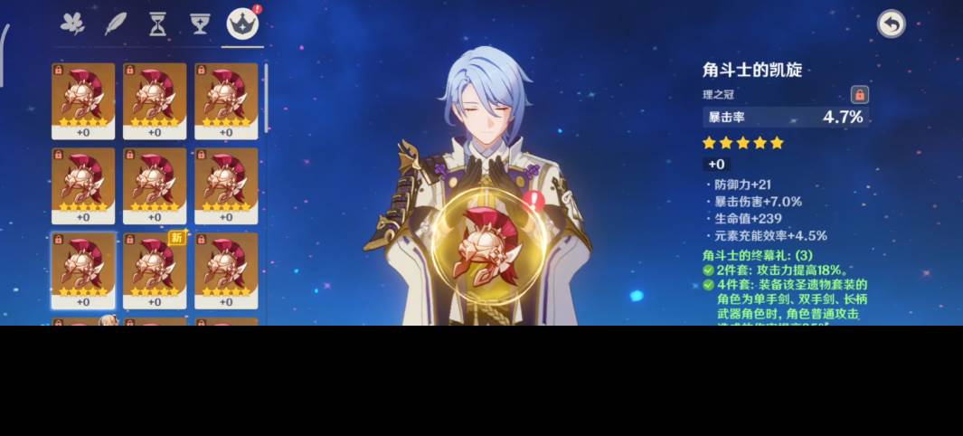 普攻增伤的效果虽然要在使用战技后才能获得,但是它的时间有15秒,而神里绫人的战技冷却只有12秒。因此实际上普攻增伤可以覆盖整个战斗过程,除了第一次使用战技前的这段时间。角斗士套装能够提供大量的攻击和普攻增伤,在没有以上两套时也可以用它,刚好神里绫人使用的单手剑符合圣遗物效果的触发需求。