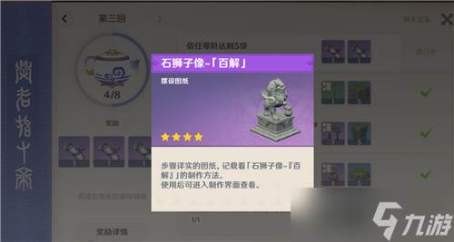 首先石狮子图纸,就是完成第三回家园任务【放置3个不同的摆设套装】的奖励,也就是说要将前面两面的家园任务给全部完成了,才能拿到石狮子图纸。