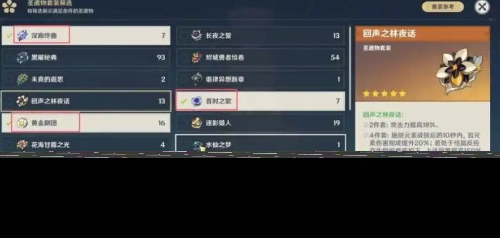 圣遗物套装推荐选择剧团4件套,其2件套提供攻击力加成,4件套可显著增强战技伤害(后台时额外提升25%),完美契合爱可菲的后台输出机制。若队伍中已有万叶、申鹤等增伤辅助,也可考虑2+2散件搭配以平衡输出与治疗。