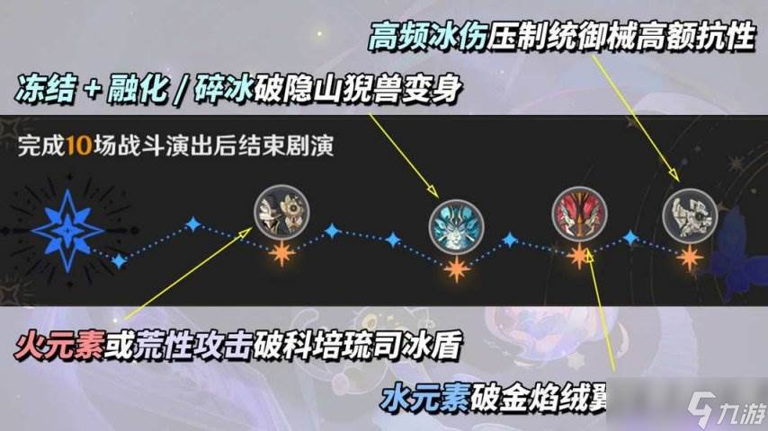 在选取辉彩祝福时,按照4个BOSS弱点划分,开局先拿融化,后续冻结>蒸发>融化。其中第6、10幕都需要冰伤破除BOSS高抗性,第3、8幕分别需要火伤/水伤破盾。