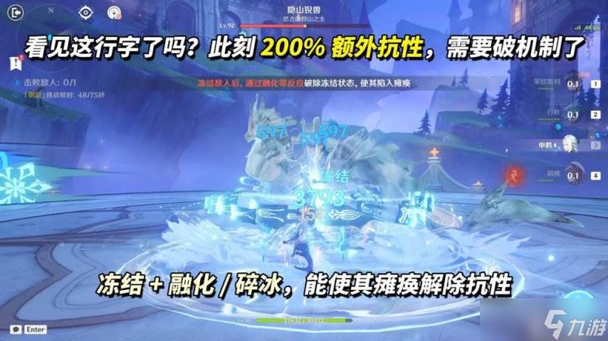 70%水风抗性,战斗中动作幅度较大容易打空技能,尽量在他落地期间进攻。战斗途中出现文字提示“冻结敌人后破除冻结状态使其瘫痪”时全抗提升200%,期间BOSS自身会附着水元素,此时1次冰伤即可冻结,后续需通过融化或碎冰反应使其瘫痪解除抗性提升。试用的莱欧斯利就够了,一个普攻+重击,直接冻结碎冰。
