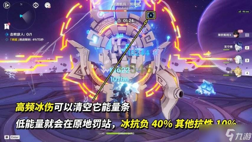 当其战斗中能量超过7.4%时,其抗性由10%提升至210%。需使用高频冰元素伤害使其重新陷入低能量凝滞状态,全抗回归10%、冰抗负40%。BOSS本身无难度,单纯需求高频冰伤压制抗性,丝柯克、莱欧斯利、神里绫华、夏洛蒂、凯亚都是不错的选择。