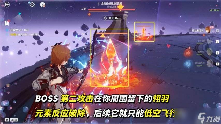 70%火抗性,开局会进入金焰形态飞行,在第二次攻击后,发射2枚火元素翎羽到你当前位置,可用元素反应破除,使其后续都只能低空飞行,方便你在地破除BOSS火盾解除变身。试用提供的达达利亚就挺好的,弓箭蓄力射翎羽,BOSS贴脸后开E普攻破火盾。
