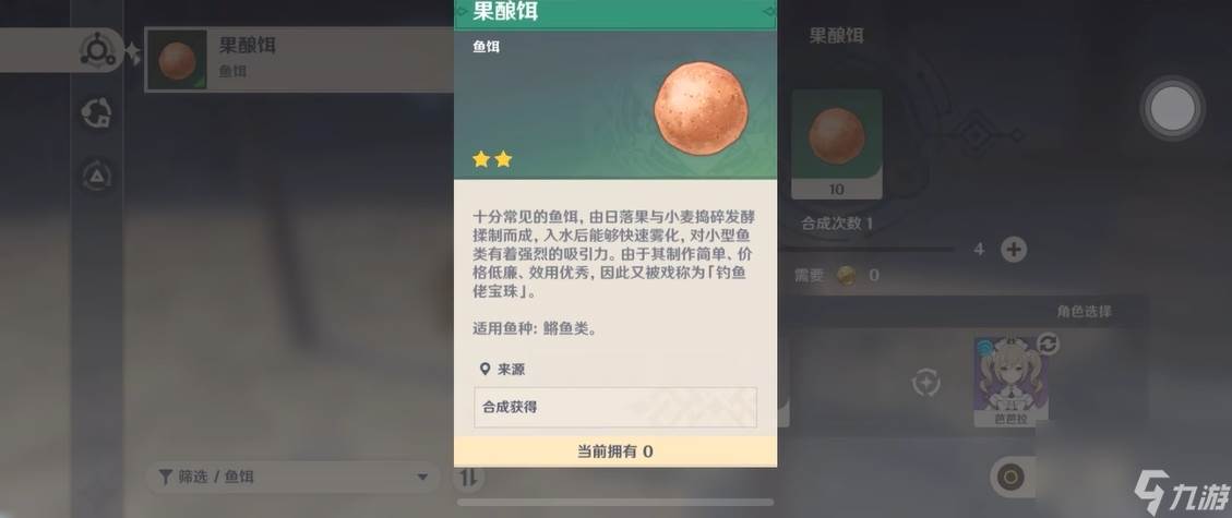 花鳉鱼饵的配方为果酿饵,制作材料需要1个日落果和1份小麦,在合成台即可制作,每次消耗材料可产出10个果酿饵。该配方无需额外兑换,解锁钓鱼系统后自动获取,属于基础鱼饵之一。果酿饵适用于所有鳉鱼类,包括花鳉、甜甜花鳉、琉璃花鳉等,是早期钓鱼必备的通用饵料。