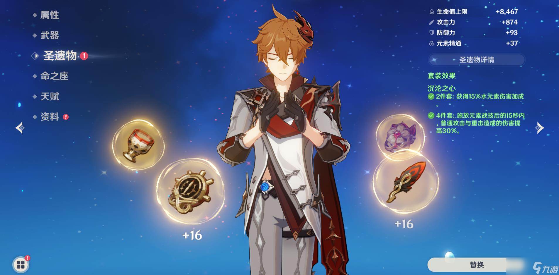 每层镜中水仙会让他在接下来八秒内提升水伤和攻击,这两个加成都可以增加他的输出。由于圣遗物本身的套装效果提供了足够的水伤加成,在选择词条时就不用再堆很多水伤了。只有杯子建议用水伤的主词条,剩下的时之沙和头冠正常堆双暴和攻击属性就行。圣遗物的副词条也是优先双暴和攻击,然后是元素精通。在进行蒸发反应时的主要伤害由火系队友提供,因此达达利亚对元素精通的需求不高,只需要补充一些就行。