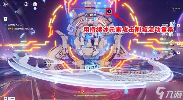 秘源机兵·统御械的主要打法是通过不间断的冰元素攻击阻止液流动量的积蓄,当能量条归零时就能对其造成大量伤害。能量条中的能量越多,BOSS旋转速度越快,造成的光柱伤害越高,能量条攒满会施放强力攻击,尽量优先选择能持续造成冰元素伤害的角色。